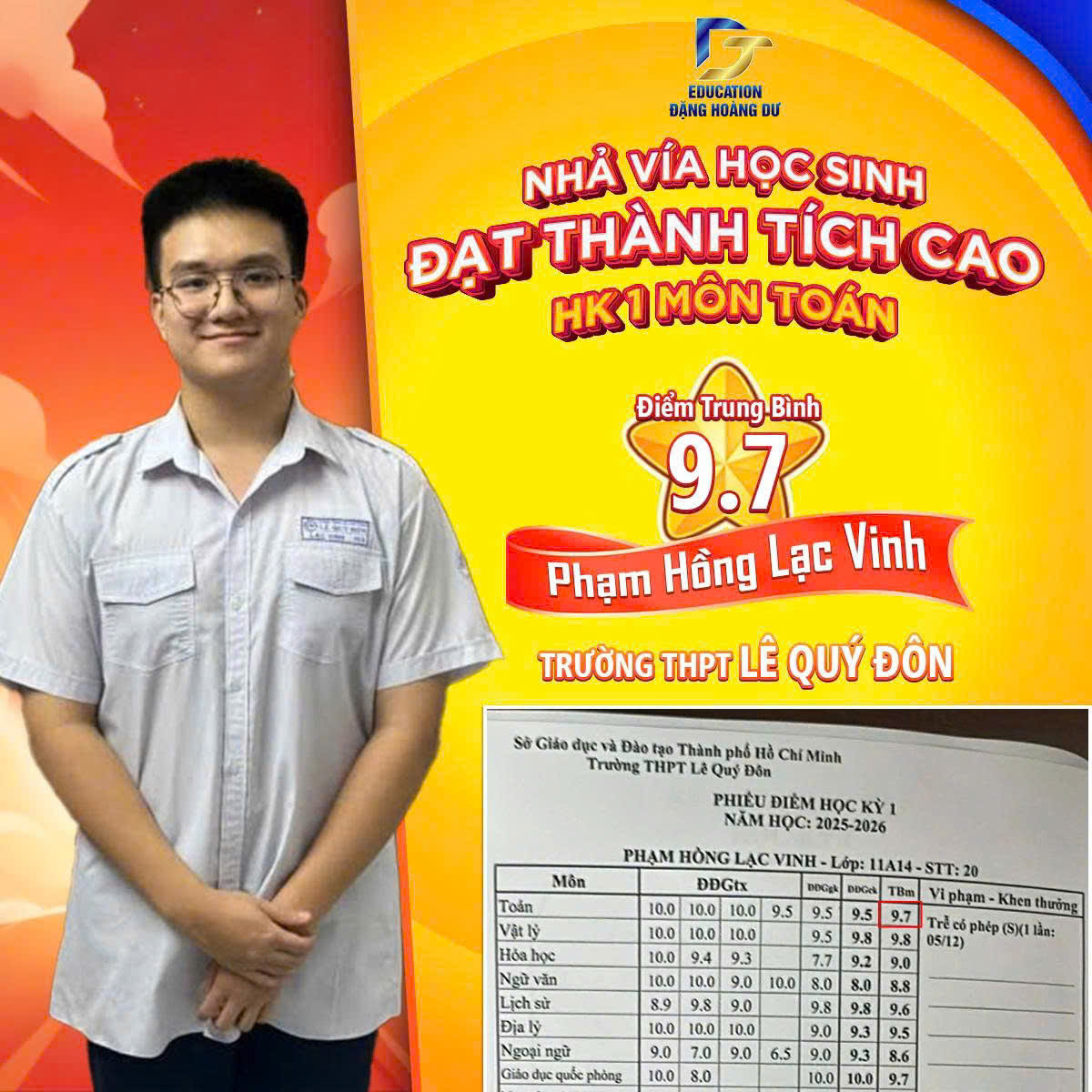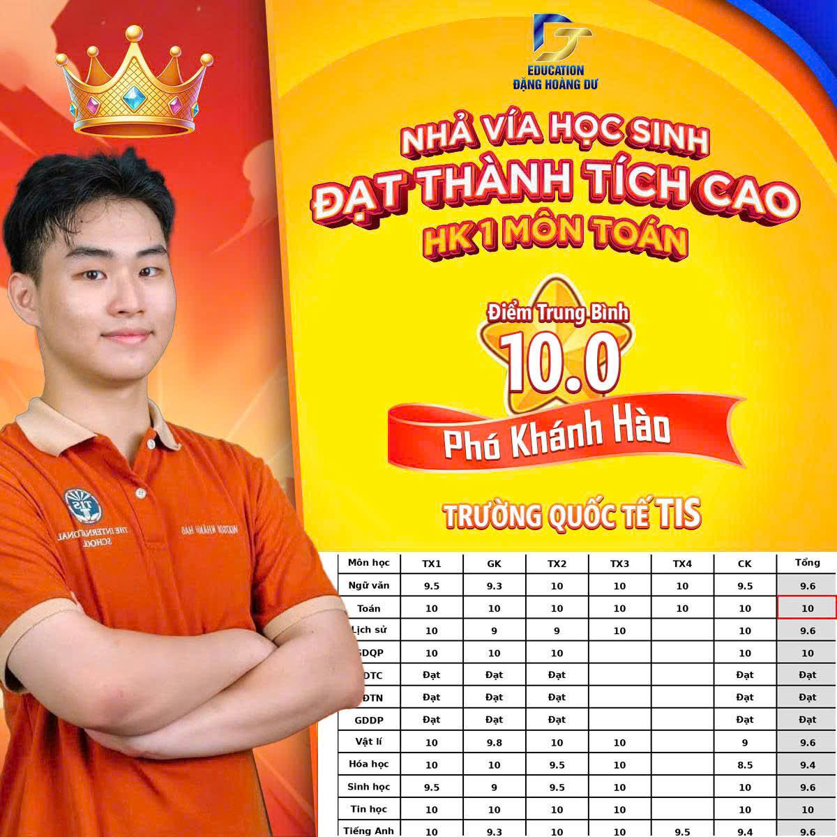 Bảng vàng danh dự của Toán Đặng Hoàng Dư vừa ghi nhận những con số ấn tượng: Hàng loạt điểm 9.5 và 10 tuyệt đối trong kỳ thi Học kỳ 1 vừa qua.